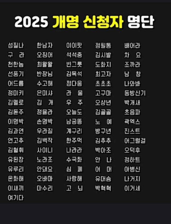 얘들아 2025년도 개명 신청한 사람들 이름이래 작성자 정보 다스베이더 작성 작성일 2025.10.23 17:13 컨텐츠 정보 56 조회 2 댓글 1 추천 0 비추천 목록 본문 사실일까? 1 추천 0 비추천 관련자료 다음 식곤증 해소법 작성일 2025.10.21 12:51 댓글 2 가을탄다님의 댓글 가을탄다 작성일 10.23 22:06 내이름도 있네? ㅋ 내이름도 있네? ㅋ 다스베이더님의 댓글의 댓글 다스베이더 작성일 10.23 22:22 어그럴걸 ㅋㅋ 어그럴걸 ㅋㅋ 로그인한 회원만 댓글 등록이 가능합니다. 목록